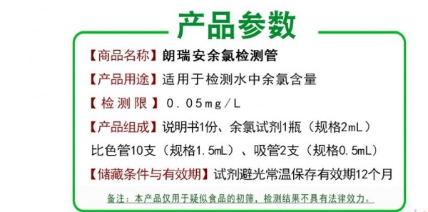 产品组成:※ 余氯试剂1瓶(规格2mL) ※ 吸管2支(规格0.5mL)