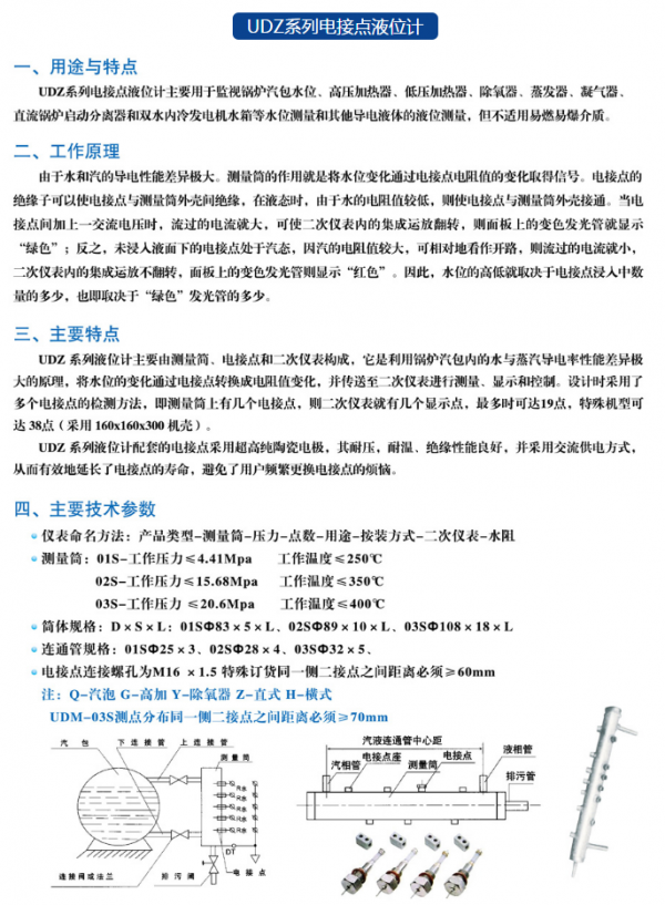 UDZ系列电接点液位计主要用于监视锅炉汽包水位、高压加热器、低压加热器、除氧器、蒸发器、凝气器、直流锅炉启动分离器和双水内冷发电机水箱等水位测量和其他导电液体的液位测量,但不适用易燃易爆介质。