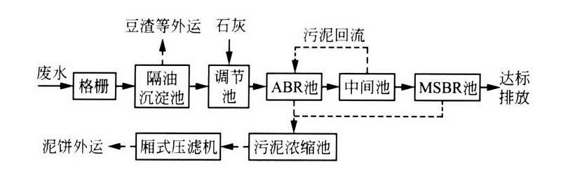 豆制品废水处理设备工艺选择应根据废水的水质、排放标准及企业的具体情况进行综合分析对比后确定,通常包括三个组成部分:豆制品废水处理设备一是预处理,目的是去除废水中的悬浮物和浮渣,采用的方法以物化为主,如筛网、沉淀、混凝沉淀、气浮等;二是生物处理,这是整个处理工艺的核心,通过微生物的新程代谢作用,分解废水中溶解性有机物,常用的方法有活性污泥法,如SBR、生物接触氧化法、射流曝气、氧化沟、浅层曝气等。厌氧生物处理方法主要有水解酸化、UASB、厌氧滤池等。结合我们多年的工程经验,确定处理主体工艺流程为“厌氧水解+混凝沉淀+气浮+生物接触氧化+二次沉淀”的主体工艺。