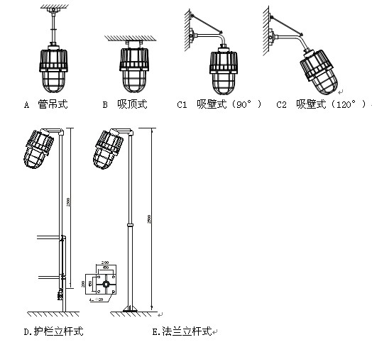 SBD3103 本灯具适用于管吊式、吸顶式、吸壁式、立杆式多样安装方式,(见安装示意图)。