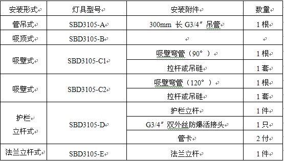 SBD3105 本灯具适用于管吊式、吸顶式、吸壁式、立杆式多样安装方式,(见安装示意图)。