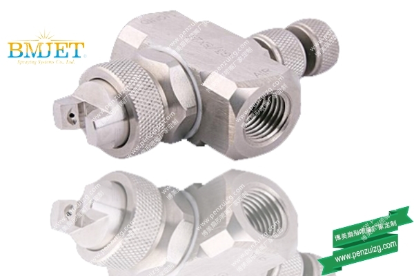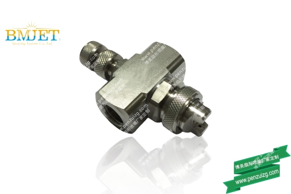 二流体扇形喷嘴特殊的内部结构设计能使液体和气体均匀混合,产生微细液滴尺寸的喷雾或粗液滴喷雾,通常,通过增加气体压力或降低液体压力可得到更加细微(30um左右)的液滴喷雾,从而导致较高的气体流率与液体率比。