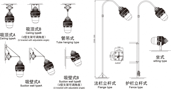 安装方式:A:吸顶式 b:管吊式 c:吸壁式 d:法栏立杆式 e:护栏立杆式