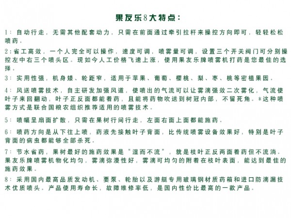 果友乐牌喷雾机是国内最专业的研发、生产小型自走式果园喷雾机的自主品牌。参考国外先进果园打药机械,改进国内传统产品的缺点与不足,集众家之所长。聘请中国农科院专家和国内多位果树专家亲临指导,历时一年多、耗资近百万研发出的一款国内最新型果园打药机械一果友乐牌喷雾机。