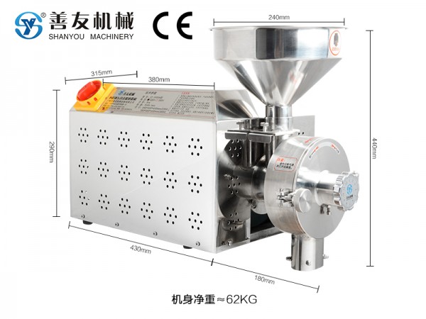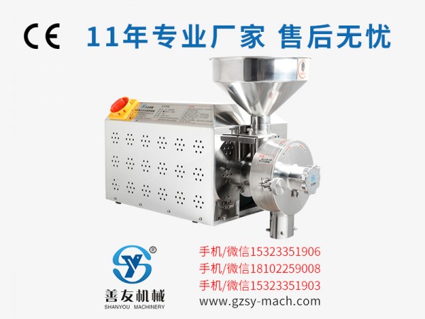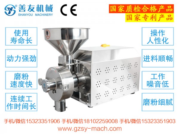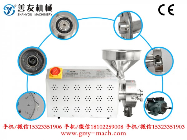 广州五谷杂粮打粉机,3.3KW五谷杂粮磨粉机厂家—广州市善友机械设备生产的不锈钢五谷杂粮磨粉机能将各种粮食、中药材研磨成50~200目的均匀粉末。该磨粉机靠两块布满齿槽的磨盘对磨运转从而将物料磨成粉末。该机属连续投料式作业,结构简单大方,噪音小,容易操作,粉碎细腻,无粉尘,适用于超市和商场专柜、加工店现场加工各种五谷杂粮和中药材使用。