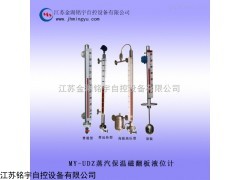 MY-UDZ蒸汽保温磁翻板液位计是在基型的主体外安装一个保温夹套而构成通入蒸汽等热媒剂。可以保持主体内液体的正常流动。因此适用于易凝固液体的液位测量和控制。对于低沸点液体可通入冷水等冷媒剂,以保证液位的稳定。使仪表正确指示出被测液位。
