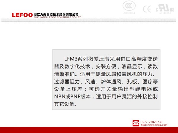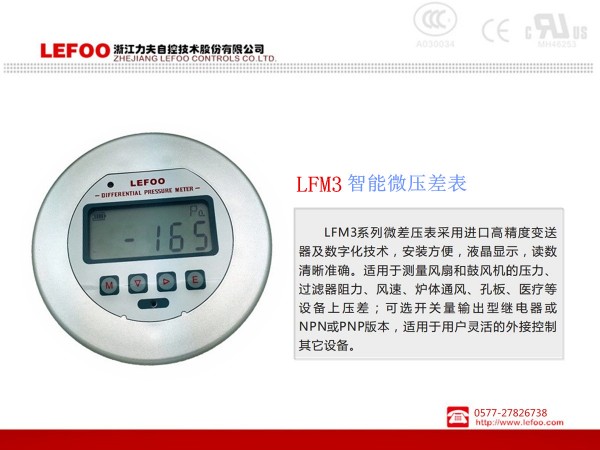 LFM3系列微差压表采用进口传感器及数字化技术,安装方便,液晶显示,读数清晰准确。适用于测量风扇和鼓风机的压力、过滤器阻力、风速、炉体通风、孔板、医疗等设备上压差;可选开关量输出型继电器或NPN或PNP版本,适用于用户灵活的外接控制其它设备。