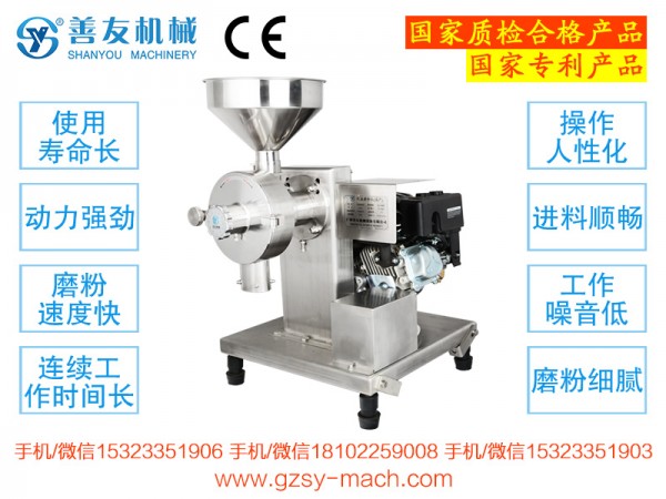 广州市善友机械设备研发制造了汽油机磨粉机,即“汽油发动机+磨粉机”,不需连接电源,通过汽油发动机传动,适合流动式磨粉作业。本机可通过控制发动机油门的大小,调节转速。