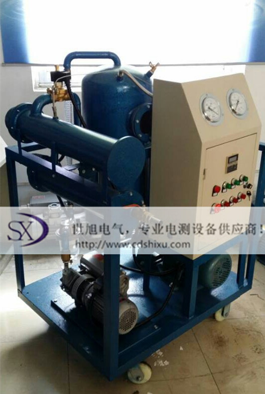连接好进出油管油路,按照机器总功率的大小接好三相四线电源,并使得真空泵、油泵转向与箭头指示方向一致,接好安全地线,检查各电路是否可靠。各油路阀门是否打开,电动真空泵、进油泵、排油泵应该无卡阻和偏心现象。有冷凝器的机型可通过排水阀向储水室注入自来水,准备无误后再操作程序。先启动真空泵,当真空表面达到负压0.08MPa时,可以打开进油阀进油,直到真空罐的油达到油标的中线位置的时候(切记将油吸入真空泵内,否则设备无法正常运转,如果不慎将油吸入真空泵内,应及时将油从真空泵内放出,在加入适当的真空油)即启动排油泵开关,开始排油过滤杂质,使油路正常循环,正常工作时,观察油标管调节进油阀,保持进出油平衡,打开加热器开关,根据真空度和水饱和曲线图设定好加热的温度给油加热,挥发油中的水分,如果油中水分过多时候,真空缸内油沫会增高,此时必须打开放气阀控制适应的真空度,待水份减少、油液下降后关闭放气阀门,使得真空度达到限。当精滤器内的滤芯表层吸附的杂质太多,需要清洗即可,工作完毕后,停机时先停加热系统3分钟,再停真空泵、进油泵,关闭进油阀,待余油拍完后停止排油泵,打开放气阀,使真空度达到正常大气压,排完缸内的油,剩下的油从放油阀放出,防止下次使用时混入不同型号的油中,后关闭空气开关。