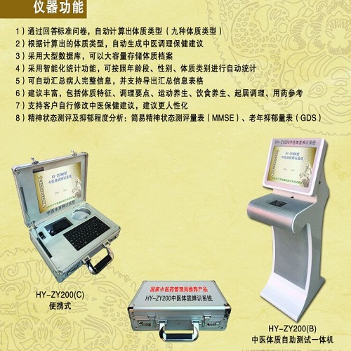 1、符合中华中医药学会颁发的《中医体质辨识判定》标准 ★2、与“老年人中医药健康管理服务规范”调查问卷完全吻合 ★3、简易智力状态检查量表(MMSE)、老年人抑郁症量表(GDS)) ★4、软件必须具有由版权局颁发的《计算机软件著作权登记证书》 |
