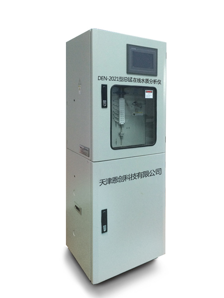 1.工作原理:DEN-2021 型总锰在线水质分析仪测量方法采用高碘酸钾氧化光度法,用高碘酸钾氧化锰为紫红色的高锰酸盐,于波长525nm处进行光度测定,在中性(pH7.0—8.6)溶液中,有焦磷酸钾-乙酸钠存在时,高碘酸钾可于室温下瞬间将锰氧化为高锰酸盐,且色泽稳定16小时以上。仪器通过比色换算直接将样品中的总锰值显示出来。 2. DEN-2021 型总锰在线水质分析仪具有以下基本功能: - 可设定、校对显示时间,包括年、月、日和时、分; - 具有设备断电、仪器漏液、试样无法导入反应器等系统异常情况下的报警功能并显示故障内容。同时停止运行直至系统被重新启动; - 每次测量结束后,自动清洗处理装置、仪器管路、阀门等部件; - 断电、断水的自动保护和来电、来水的自动恢复功能; - 定时清洗、定时做样功能; - 触摸屏查看更直观,操作更方便;