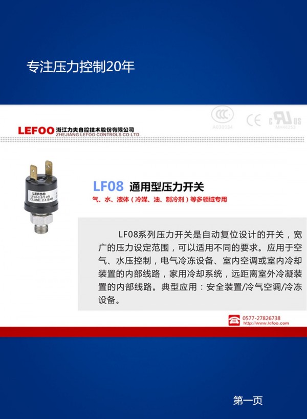 力夫公司自创立以来致力于可靠、优质的压力控制设备的开发和制造。公司能够针对机器运转的需求,设计和制造出符合各种控制要求的压力开关。
