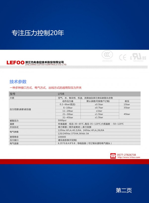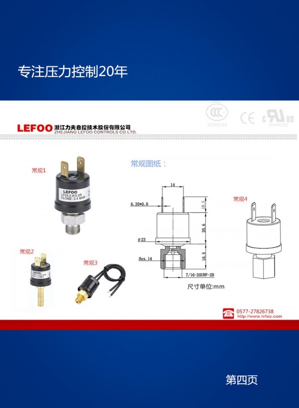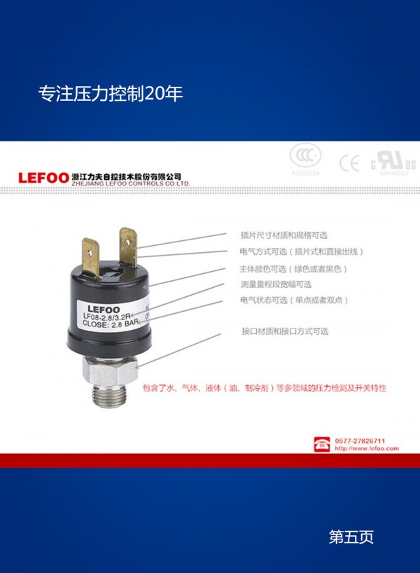 力夫公司自创立以来致力于可靠、优质的压力控制设备的开发和制造。公司能够针对机器运转的需求,设计和制造出符合各种控制要求的压力开关。