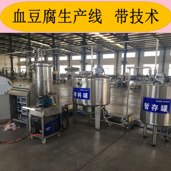 血豆腐成套设备血豆腐成套设备工艺流程大部分为手工作坊式加工,并且猪血豆腐传统加工配方不统一,原料质量不统一,工艺品不规范,加工方法各异,致使产品味道差异大,易于腐败,卫生不合格,保质期短。针对以上情况,通过新鲜猪血抗凝、凝固、灭菌等多道工序,使猪血豆腐加工工业化,并提高猪血豆腐的口感、外观及保质期。