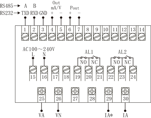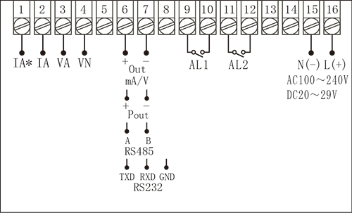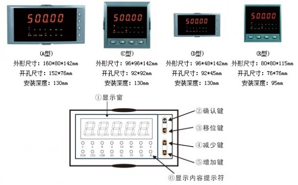 1、规格尺寸为A、C、D型仪表,模拟量输出、通讯输出和累积脉冲输出在同组接线端子上,只能选择其中一种功能。