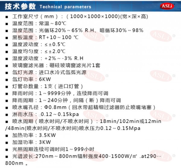 光谱波长:290nm~800nm辐照度范围500W~1120W/㎡累积光照能量14000~67000KJ/㎡
