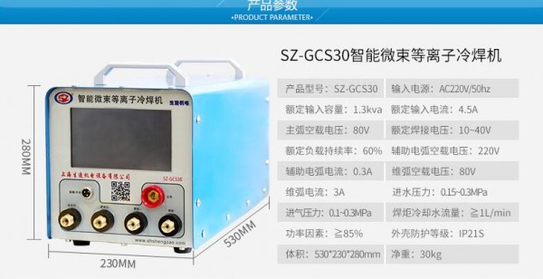 智能微束等离子冷焊机SZ-GCS30是当今高科技的产物被誉为薄件焊接”由于具有脉冲工作方式,因此溶池容易控制,热影响区小,焊接电流可以小到0.1A稳定燃烧、对于厚度为0.1~2.5mm薄板焊接尤其适用,具有氩弧焊无法替代的微小电流电弧指向性和大电流熔化速率和溶深,焊接效率是氩弧焊TIG焊2倍,用于薄件焊接,单面焊接双面成形,焊缝美观,是激光焊的替代工艺,配以专机易实现自动焊。