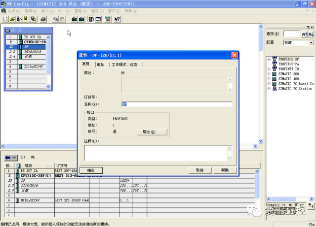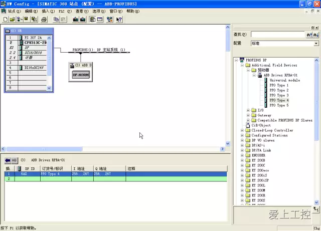 3、在Profibus-DP硬件配置中添加从站ABB Drives RPBA-01,站号为3(或其它),速率及配置文件同DP主站,选择PPO Type 4。