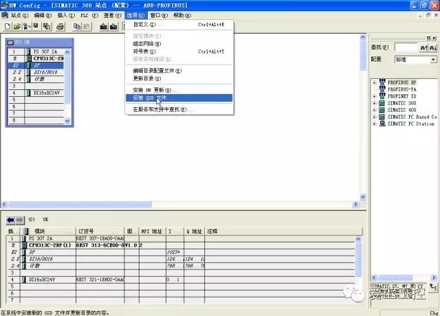 1、启动step7,进入到硬件组态画面,组态完硬件后,安装ABB变频的GSD文件ABB_0812.GSD。