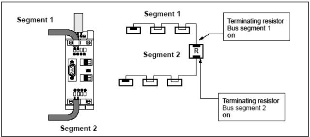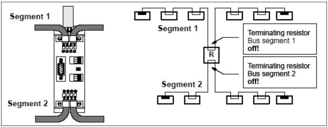 此时,网段1和网段2都按照上一种拓扑中网段2的方式进行连接和拓展。即终端电阻为“Off”,网段1的总长度为200米(1.5M bps),网段2的总长度也为200米(1.5Mbps)。两个网段之间是电气隔离的。当网络中的终端站出现断电情况时,终端电阻也因无法得到电源而丢失(其实是电阻值发生变化),这将导致信号中断或者出现乱码,从而影响到另外一个网段甚至整个网络的通讯质量,因而建议可以将两个网段断开,这样可以避免网段之间的相互干扰。