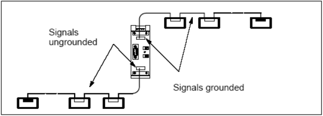 该网络拓扑中,网段1仍然时正常的连接,但网段2不是网络终端设备了,而是网络中间的一个设备,此时终端电阻应当设置在“Off”,而网段2上的两个终端设备应分别设置终端电阻。在这种网络拓扑中,网段1的连接方式和距离和上一种方式相同,但网段2的扩展距离是从网段2的左、右两个终端站点之间的距离(1.5M bps 时200米)。