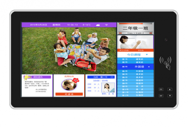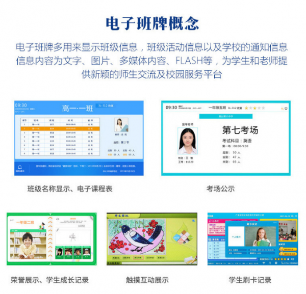 电子班牌多用来显示班级信息,当前课程信息,班级活动信息以及学校的通知信息。信息内容为文字、图片、多媒体内容、flash等,为学生和老师提供新颖的师生交流及校园服务平台。