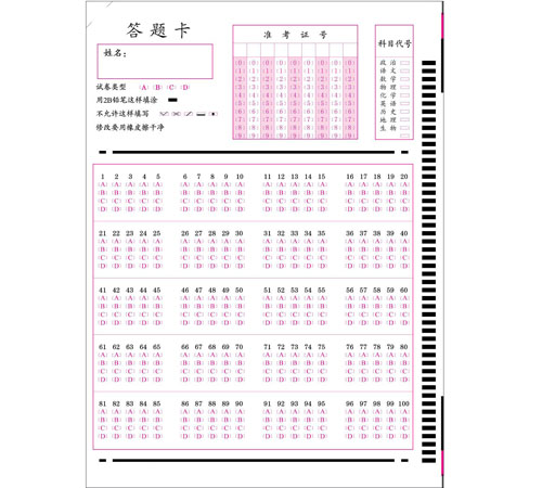 64K答题卡------正64K答题卡尺寸为95×65mm,大64K答题卡尺寸为105*172.5mm,有时会根据信息卡内容或美观稍做调整,但调整区间非常小。对于题目小于50题的卡一般为64K。