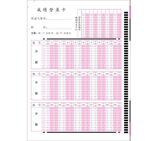 光标阅读机对信息卡上的所有被阅读部分的定位精度要求较高,所以制作一张答题卡有很多要求。它要求所用纸张纤维要长,纸张薄厚均匀,挺括程度好、施胶度较高、光滑度好、涨缩均匀,且涨缩较小,以及印刷的套印和基准边的裁切精度较高。只有满足上述条件,阅读机在阅读答题卡时不会因造纸原料差和施胶度低产生掉渣、掉粉现象而挡住光电头,造成阅读错误,不会因纸张薄厚不均,挺度、光滑度差,在连续阅读时产生大量双张、卡纸等现象,不会因纸张涨缩太大或印刷、裁切精度低使阅读点定位不准,而读不到或读错。