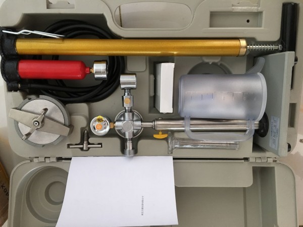 〖操作过程〗NS-1型泥浆失水量测定仪:由打气筒提供的压缩空气,经减压阀后可调整为所需要压力值送往泥浆杯(进入泥浆杯的通道由放气阀控制)杯内的泥浆因压差失水。当压力表指针稳定的0.7Mpa时,计时30min,所流出的滤液即为该泥浆的失水量。当测量7.5min时失水量已大于8ml,此时的失水量乘以2,即为该泥浆的近似失水量,但需在记录中注明测定时间为7.5min。