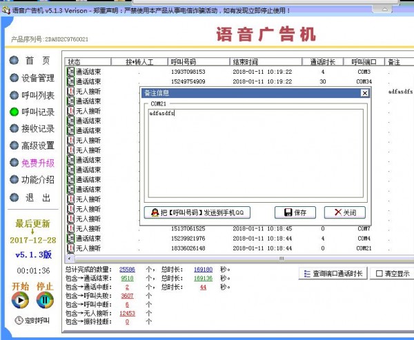 5、自动检测: 空号,停机的号码,设备3秒自动拨打下一个。