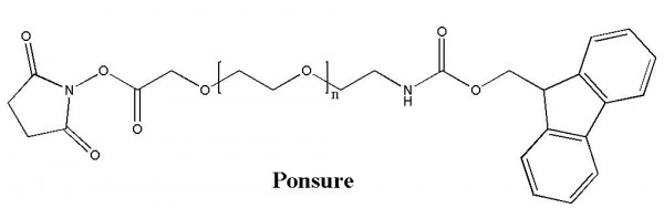 芃硕生物(Ponsure)的Fmoc-PEG活性酯(FMOC-NH-PEG-NHS)可以用来修饰蛋白质、多肽以及其他活性基团材料或者小分子。活性酯(-NHS)能与氨基(-NH2)反应的PEG衍生物,在PH7-8.5与伯胺基团反应形成稳定的酰胺键。FMOC(FMOC-NH-)可以保护氨基,也很方便脱去保护。聚乙二醇(-PEG-)可以增加溶解度和稳定性。减少多肽和蛋白质的免疫原性,它也能抑制带电分子在修饰表面的非特异性结合。