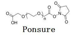 芃硕生物(Ponsure)的羧基PEG活性酯(NHS-PEG-COOH)可以用来修饰蛋白质、多肽以及其他活性基团材料或者小分子。NHS在PH7-8.5与伯胺基团反应形成稳定的酰胺键。羧基(-COOH)可以很容易的和氨基形成稳定的酰胺键,也可以和羟基形成酯键。