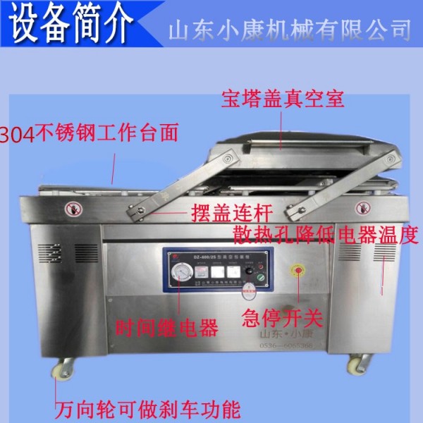 供应山东小康牌粽子真空包装机DZ-600/2S整机采用不锈钢框架,确保设备整体质量均衡,大大提高了设备的使用寿命。采用四连杆结构,上工作室可在两个工位上作业,操作方便,效率高,节约能源。