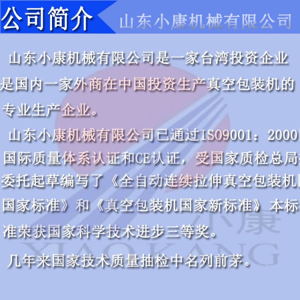 山东小康机械有限公司成立于1995年,二十多年来山东小康机械有限公司只专注于真空包装机的研发与制造,主要生产出口全自动连续拉伸真空包装机、全自动真空包装机、贴体真空包装机、冷却肉真空包装机、盒式真空包装机、滚动式真空包装机、真空充气包装机、液体包装机、成型包装机、粉末专用真空包装机等,产品销售全国并销往世界各地。