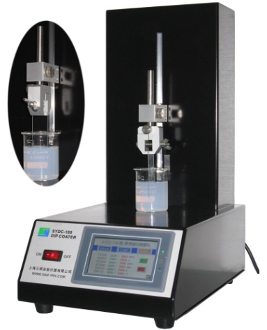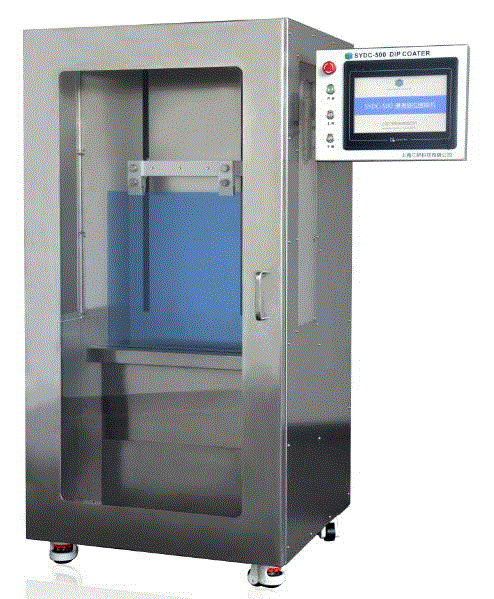 SYDC-300型浸渍提拉镀膜机是专门为液相法(特别是sol-gel法)制备纳米薄膜材料而设计。将洁净干燥的基片浸入镀膜溶液中,通过预先设置的参数,将浸渍后的基片以一定速度提拉起来,在基片上附着一层膜,称为“湿凝胶膜”,随着溶剂的挥发,膜层在基片上固化成为“干凝胶膜”。“干凝胶膜”经过进一步的干燥及高温热处理便得到所需的纳米薄膜材料。