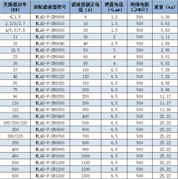 绿波杰能MLAD-V-SR系列变频器输入端专用进线滤波器——选型表