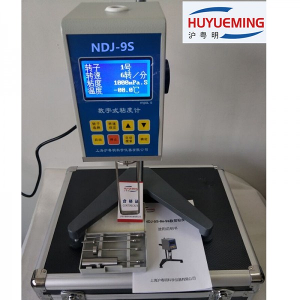 本仪器为数显粘度计,由电机经变速带动转子作恒速旋转,当转子在液体旋转时,液体会产生作用,在转子的粘度力矩,该粘度力矩也越大,反之,液体的粘度越小,该粘度力矩也越小,该作用在转子上的粘度力矩由传感器检测出来。与同类仪器相比,NDJ-9S粘度计不仅操作简便,转速稳定,测量精度高,工作电压范围宽,它还具备自动搜索功能,即能够搜索测量未知样品所需的转子和转速。