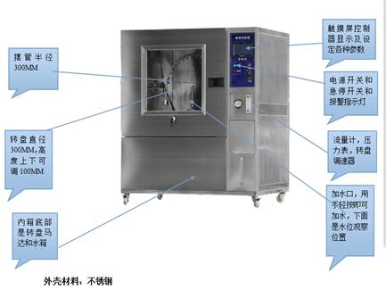 淋雨试验箱主要用途:本产品适用于考核电工产品,外壳和密封在淋雨环境下能否保证设备和元件良好性能的试验。本产品采用科学设计,使得该设备能够逼真的模拟滴水,淋水,溅水,喷水等各种环境。走进的控制系统以及变频技术的采用,使得降雨量试品架的回转角度,喷水摆杆的摆动角度以及喷水量摆动频率都可自动的调节。