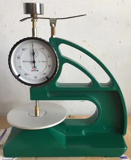 2、用手指按下操纵杆,使测足上台,将被测片材质放在平台与测足之间,轻放操纵杆此时表的读数,即被测物的厚度。每个待测尺寸至少要取5个测量值,计算5点的平均值作为该卷材的厚度并报告zui小单位值。