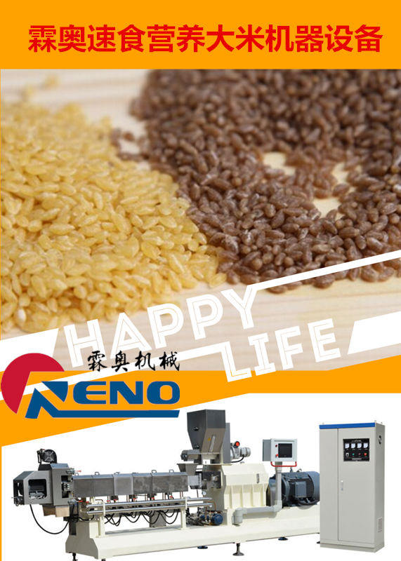 速食营养米是随着社会进步和生活节奏加快,逐渐兴起并流行的新款快餐样式和速食种类。大米不同于其他的食品,颗粒小,吃法多,炒焖炸煮各种做法都可以使用。方便携带,容易包装,容易熟化,简单的食用方法就是:洗过的大米粒直接泡到热水瓶内,水瓶内就会成为可口香喷喷的大米粥共自己早餐食用。这也是济南霖奥机械公司研发速食营养大米生产设备的初衷和缘由之一。速食大米设备生产线