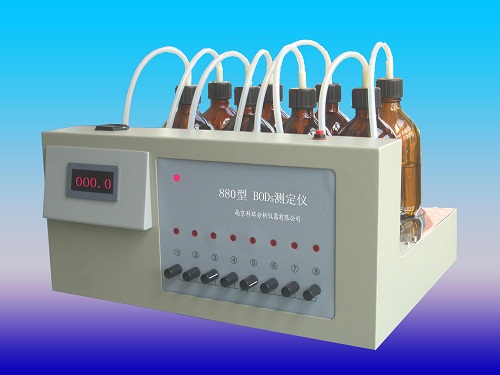 数字式BOD5测定仪采用空气压差法原理设计而成,当被测样品在20±1℃条件下恒温进行五日培养后,经过生物氧化作用,有机物转变成氮、碳和硫的氧化物,并产生二氧化碳气体被氢氧化钠吸收,培养瓶内压力减少,通过压力传感器将变化量转为电信号,从而可以检测出被测样品BOD5的值。