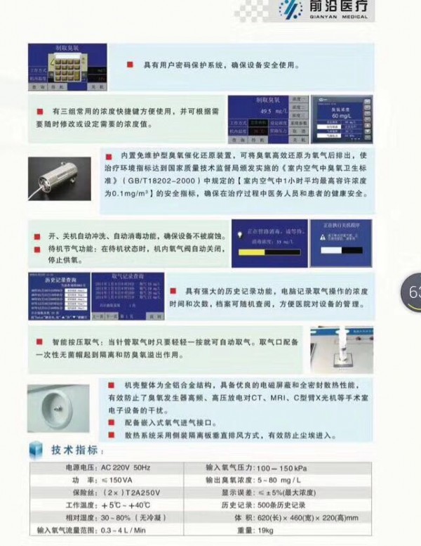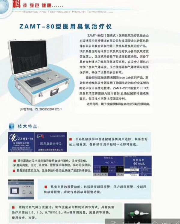ZAMT-80型(便携式)医用臭氧治疗仪是由山东淄博前沿医疗器械有限公司研制的高科技臭氧治疗产品。该机具备标准臭氧治疗仪必备的臭氧浓度值在压力、温度扰动参数下自适应校正功能,装备了具有的臭氧催化还原系统,在安全方面机内增加了臭氧气体温度、压力传感器和气体泄露与超压保护阀,确保了设备的安全有效。