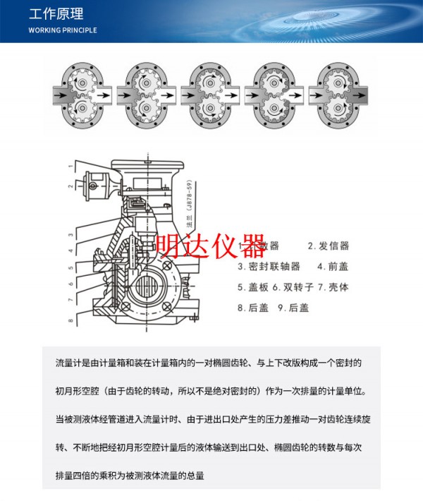 在仪表测量室进出口两端液体压差的作用下,一对椭圆齿轮在轴上不停地转动并排出液体,测出椭圆齿轮的转数即可知道流经仪表液体的总值。