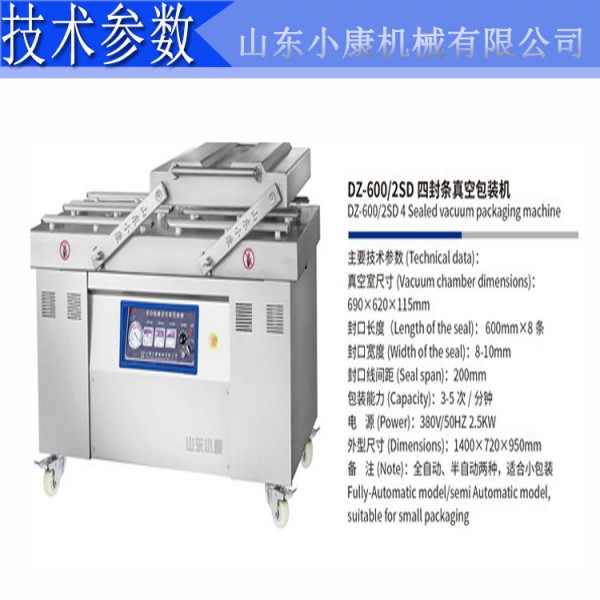 山东小康供应麻辣牛肉干真空包装机DZ-600/2S型四封条真空包装机整机采用不锈钢框架,确保设备整体质量均衡,大大提高了设备的使用寿命。采用四连杆结构,上工作室可在两个工位上作业,操作方便,效率高,节约能源。