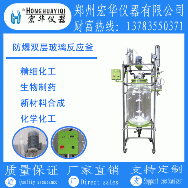 S212-F-100L双层玻璃反应釜/双层玻璃反应釜/内夹层玻璃釜/夹套反应釜为双层玻璃设计, 内层放反应溶媒,可做搅拌反应,玻璃反应釜夹层可通上不同的冷热源(冷冻液、水或热油)做循环加热或冷却反应,在设定恒温条件下,在密闭的玻璃反应釜内,可根据使用要求在常压或负压条件下,进行搅拌反应,并能做反应溶液的回流与蒸馏,玻璃反应釜是现代精细化工/生物制药和新材料合成的理想设备。