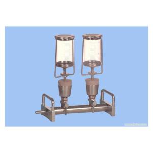 2.将滤器接杆上的橡胶塞,插入不锈钢底座,滤器的多小孔平面上装上浸泡的滤膜,放上不锈钢滤器倒入水样至相应刻线,便可进行抽滤。