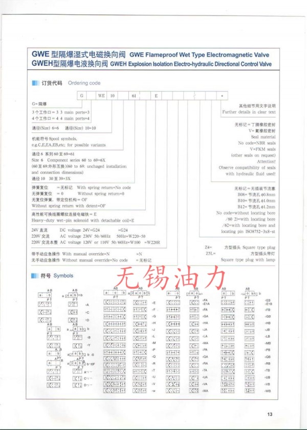 隔爆电磁换向阀GD-4WE6E61/EG24NZ4公司主要代理销售:力士乐、油研、威格士、大金、派克、丹尼逊、阿托斯、不二越、哈威、穆格等液压油泵,电磁换向阀、溢流阀、单向阀、节流阀、调速阀、叠加阀、电液阀、顺序阀、手动阀、截止阀、卸荷阀、减压阀、油缸、滤网、滤清器、滤油器、液位计、冷却器、蓄能器、压力表开关、压力继