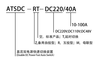举例:ATSDC-Z-DC220V/40A,表示:用于主备型直流双电源隔离零延时无扰切换场合,直流母线电压为220V,母线电流40A。