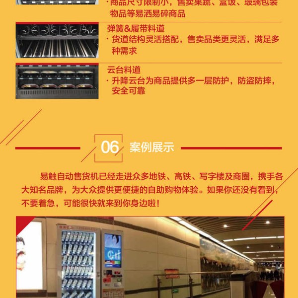 目前,易触自动售货机遍及全国85%以上的地铁线路和部分高铁站、机-场,北京、上海、广州、深圳、长沙、宁波、杭州、苏州、无锡、西安、武汉、长春等国内大中城市的交通枢纽都可看到易触自动售货机靓丽的身影。