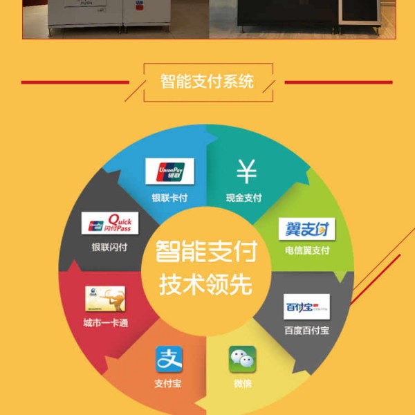 结合传统的纸币、硬币购买方式,“易触科技”率先将多种电子支付方式应用于自动售货机,包括支付宝支付、微信支付、银联闪付、APPLEPAY、城市一卡通等多种非现金支付方式;目前国内售货机行业,易触公司的软硬件产品覆盖最全,可以向市场提供产业链需求的全部机型。